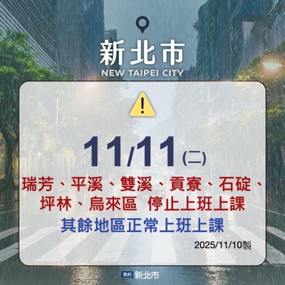 明(11/11)日除瑞芳區、平溪區、雙溪區、貢寮區、石碇區、坪林區及烏來區停止上班及上課外,其餘各機關學校照常上班及上課。