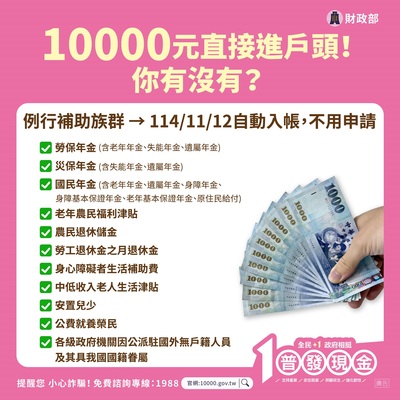 4. 直接入帳:特定對象(依發放現金辦法規定,已有例行性領取政府津貼或年金者)免登記,11/12 直接匯入個人帳戶。